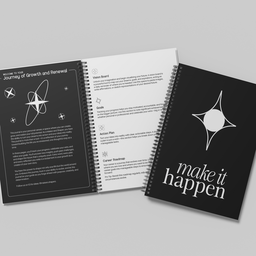 The Make It Happen Notebook by Makers & Shapers (owned by Katly Investment), designed to help graduates plan, dream, and achieve in their next season of life